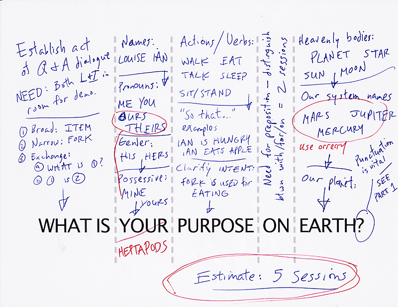 Habría, pues, que buscar factores comunes a dos especies distintas, que permitirían crear una zona de entendimiento mutuo. Entre ellos, se propusieron elementos de origen científico —matemáticas, química—, morfológico —en caso de que los alienígenas tuvieran extremidades y cuerpos con funciones semejantes a los nuestros—, protolingüísticos —sonidos onomatopéyicos—, y otros de utilidad más o menos dudosa.