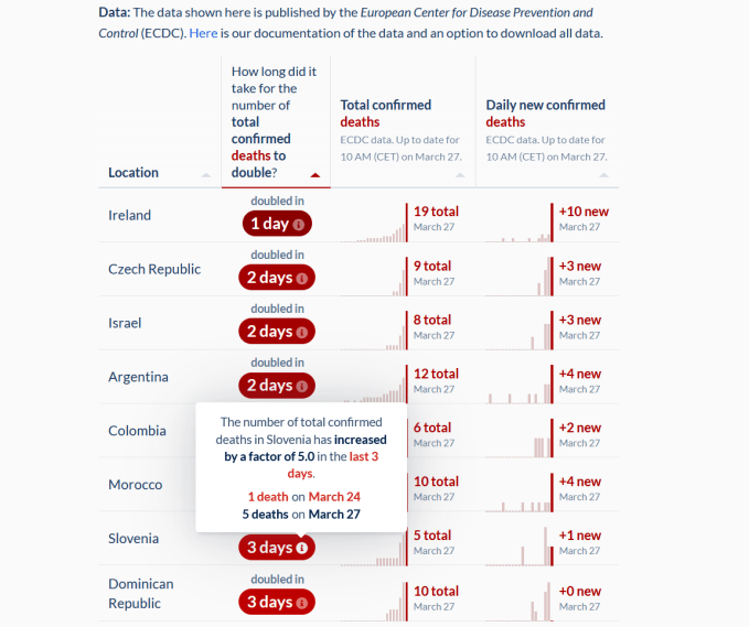Por ejemplo, en la imagen de abajo se ve que Irlanda ha duplicado su cifra de muertes en 1 día, la República Checa, Israel y Argentina en 2 días, Eslovenia en 3 días, etc. En la gráfica, el cursor detenido sobre la i (información) de Eslovenia, me dice que el número total de muertes confirmadas se ha multiplicado 5 veces en los últimos 3 días. De 1 muerte (24 de marzo) se ha llegado a 5 (27 de marzo).