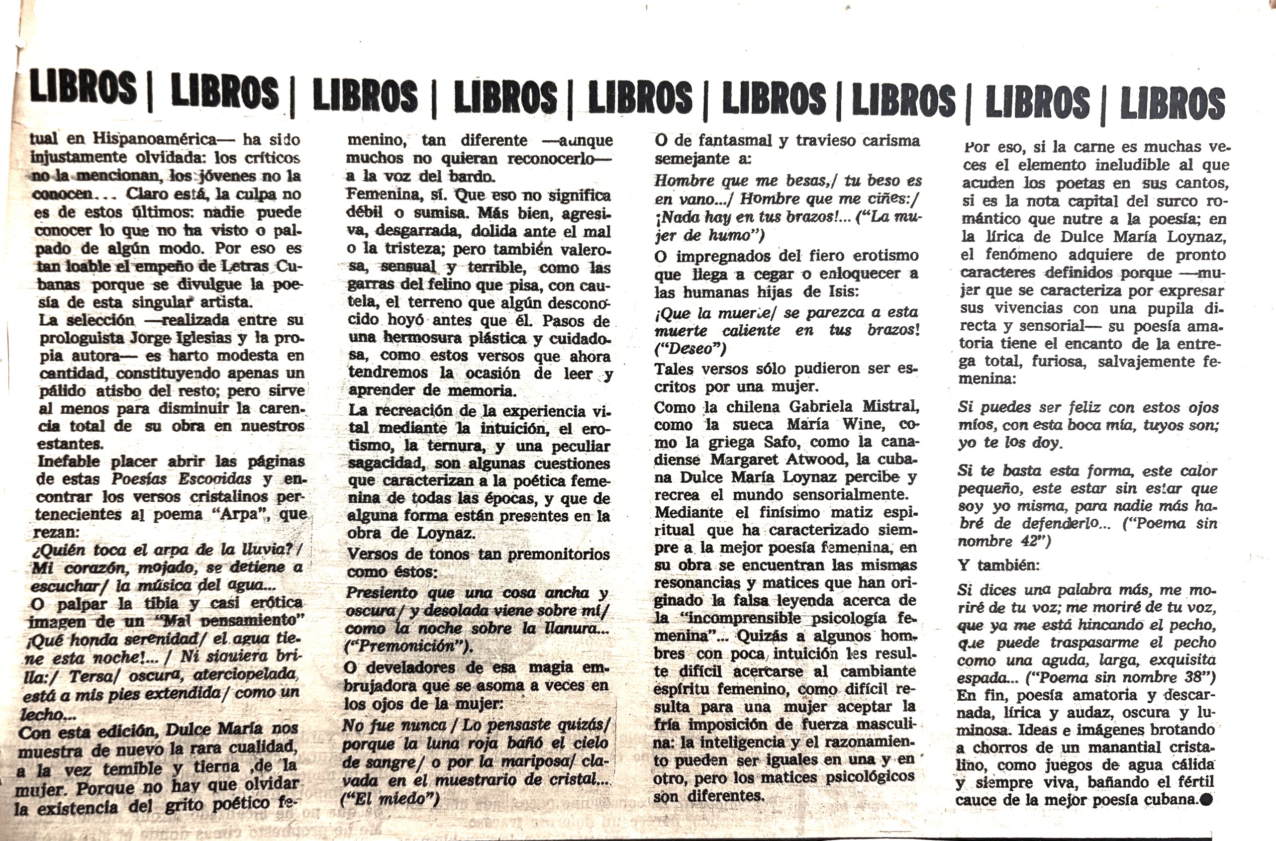 Por mi parte, sigo amando la levedad de su prosa, esa inasibilidad de las circunstancias, como mismo amé su poesía cuando la descubrí mientras buceaba en los polvorientos archivos de la Biblioteca Nacional José Martí, de La Habana, en los lejanos años ochenta, hasta tal punto que me atreví a dedicarle un artículo —publicado en El Caimán Barbudo en 1985, hace ya la friolera de 40 años— a sus Poesías escogidas (Letras Cubanas, 1984), la primera antología de su obra que se publicó en Cuba después del largo ostracismo oficial al que fuera sometida durante décadas. Perdí ese ejemplar, tantas veces leído y manoseado, cuando mi padre tuvo que deshacerse de lo que quedaba de mi biblioteca habanera, imposibilitado de luchar contra las plagas que la invadían. Espero que ese libro esté hoy en manos de algún lector que valore su poesía.