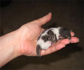 Esto fue lo que ocurrió. El sábado por la tarde, cuando salía de visitar a mi hermana, escuché los chillidos lastimeros de un gatito recién nacido. Busqué entre la hierba y allí, como un gusanito lleno de fango y completamente mojado, había un minino casi microscópico, con el cordón umbilical aún colgando de su pancita. Por supuesto, tenía los ojos cerrados y ni siquiera podía hacer sus necesidades. Los gatos recién nacidos son incapaces de eso. Es la madre quien debe lamerlos para estimular el flujo de desechos durante los primeros días. Aun sabiendo eso, me lo llevé a casa porque no tuve corazón para dejarlo allí.